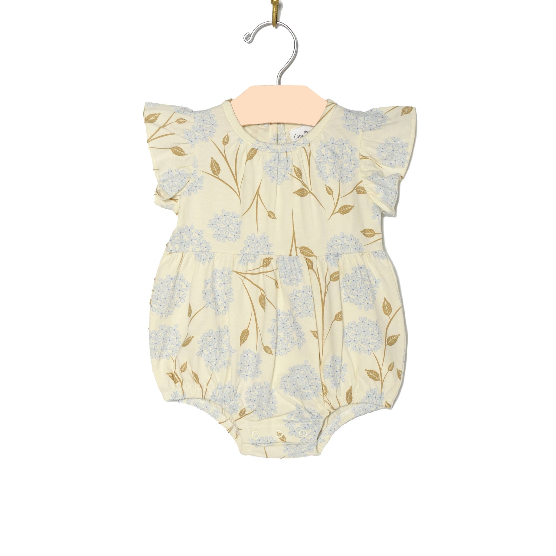 Our best selling hydrangea print is back in a new silhouette- flutter sleeves and a bubble waist make this both easy and stylish. In our 100% cotton combed jersey and with snaps at the crotch for easy changing it's perfect for spring adventures and events.