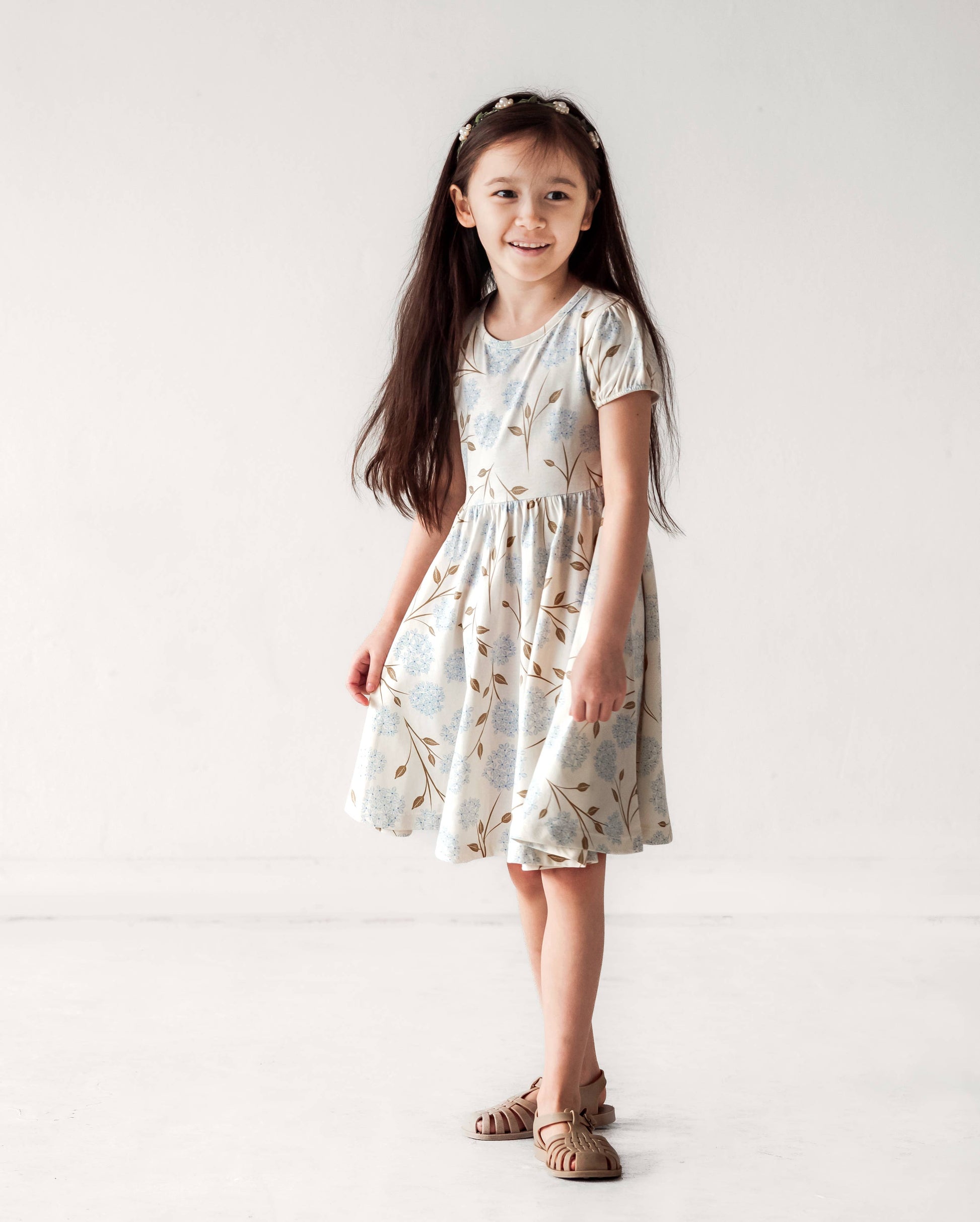 Our favorite twirl dress gets an updated puff sleeve! In our 100% cotton combed jersey and with a wide skirt for twirling, our most popular hydrangea print is perfect for dressing up or down and taking her on all her adventures.